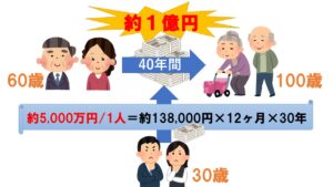年金を考えずに、定年の60歳から月々の最低費用22.1万円を貯蓄で補う場合、60歳から100歳までの40年間の費用は、夫婦で約1億円もの貯蓄が必要になります。