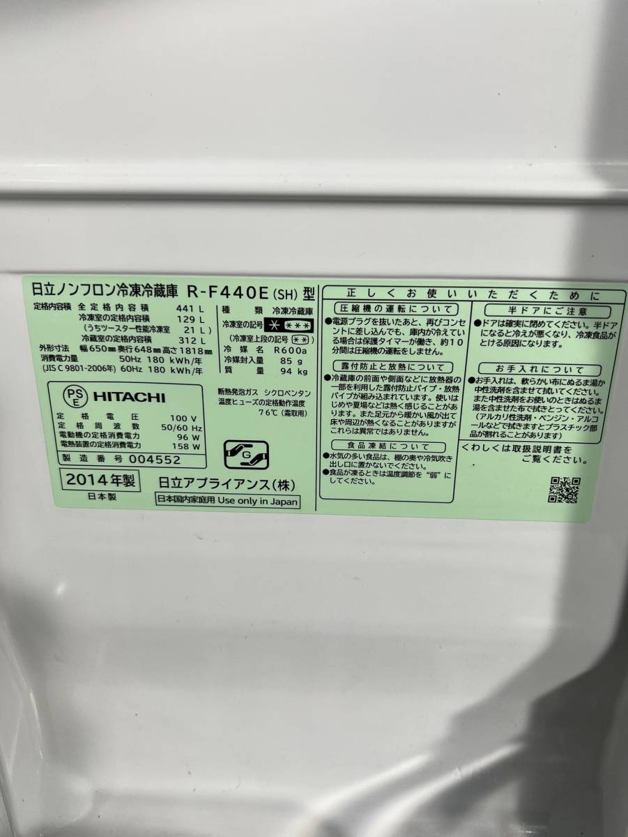 東京都港区のお客様より 動作確認済み 日立 真空チルド 441L 6ドア 冷凍冷蔵庫 R-F440E 2014年製 フレンチドアをお買取させて頂きました!