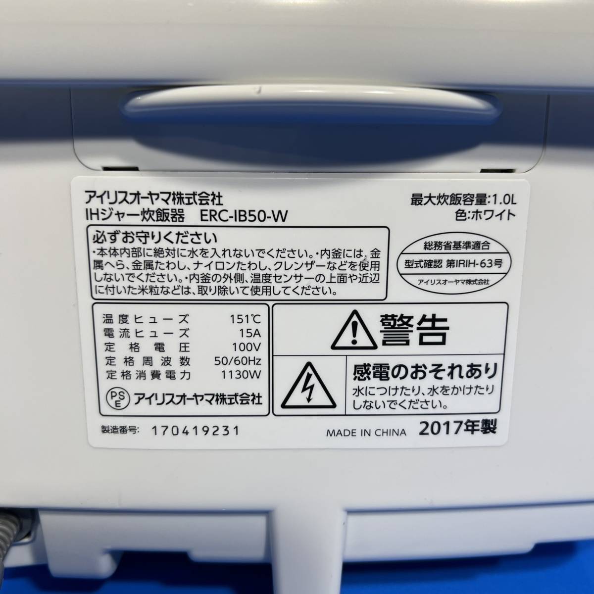 千葉県千葉市緑区のお客様より ERC-IB50-W IRIS OHYAMA アイリスオーヤマ IHジャー炊飯器 5.5合炊き 2017年製 ※ジャンク品をお買取させて頂きました!